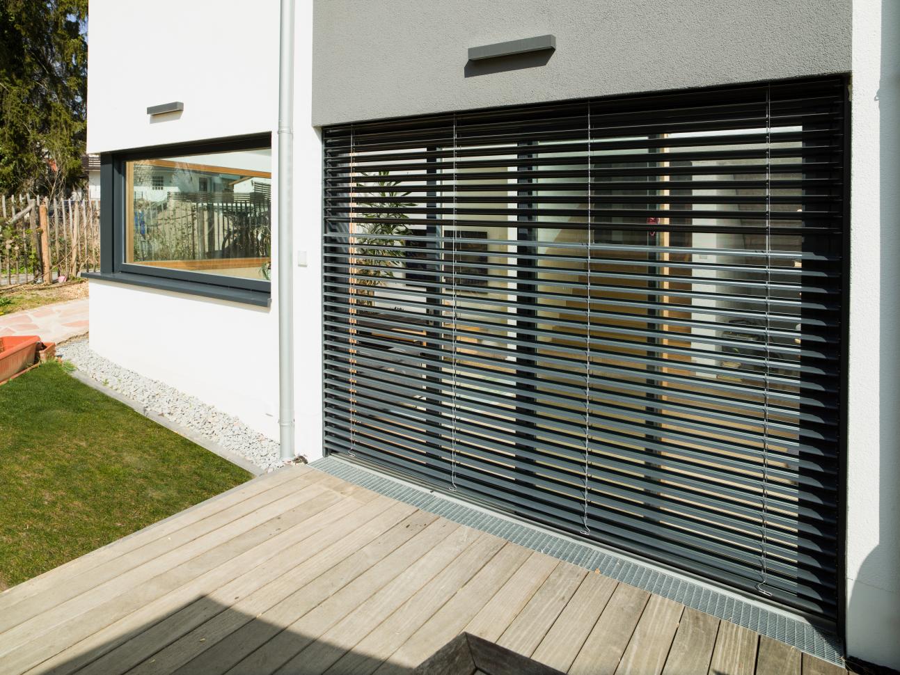 Raffstorenlamellen wirken herabgefahren sehr filigran und verleihen der Fassade eine pure und flache Optik.